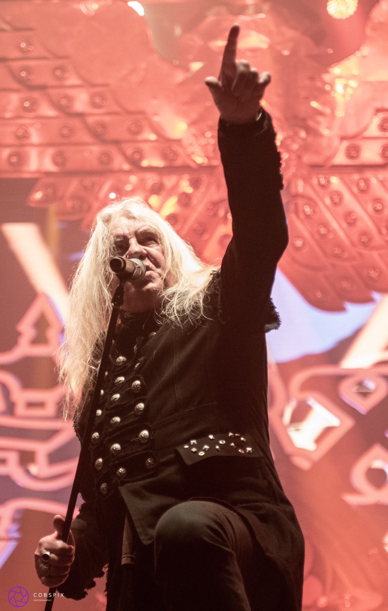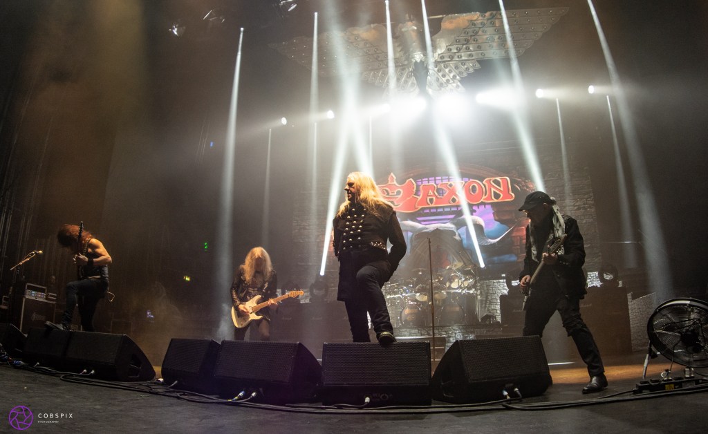 I hot foot it down to the front for the big headliners of the night – SAXON! Just before they graced the stage, we had a slideshow of a few images of them from the last 40 years which was a nice touch I thought. The backing drops to the floor and they are on stage to huge cheers. Biff looking ever so cool in his long black coat and announcing he is 71 years old! No way! He can still belt out them huge songs of theirs and looks great. Doug Scarett on lead guitar played with such confidence and Tim Carter coming to the front several times to head bang along with the crowd while bass bashing. At one point a cut off denim jacket full of patches was launched on stage by a fan, Biff not hesitating to wear it the rest of the set. They had an amazing ever changing backdrop of videos, and huge skulls, and the huge eagle which was hanging in the background was brought down to hover overhead. What an amazing show this was and I can tell that place was full of loyal fans of Saxon from over the years. Some very happy faces in there. You can catch the guys again later in the year.