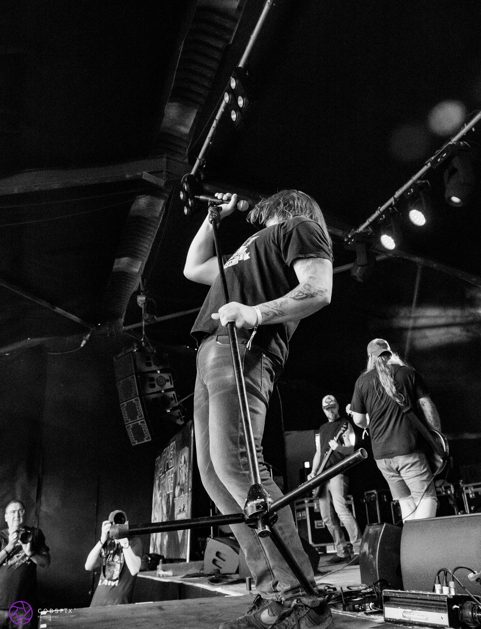Day 3, and not as sunny Sunday arrived. I get on site a for the little later than usual start time and but in enough time to watch Ashen Reach in the big top, who got a mosh pit going at 1130am! Very impressive and and I am a fan of this band’s heavy rock sound, they will go far in my opinion. I head over to main stage straight after for Gin Annie. This is Bev’s favourite band so only right she got to announce them on stage. The guys brought their energetic set and rocked that Trouper stage to the max!