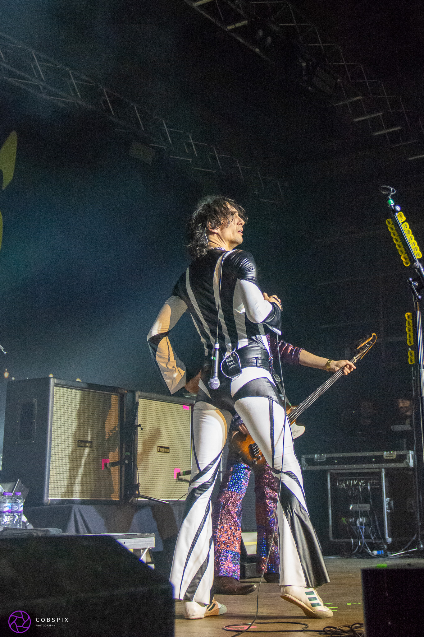 The band appear on stage followed closely by the ever flamboyant Justin in his fabulous spandex black and white all in one suit. Launching into their first song ‘Black Shuck’ the crowd were off bouncing already until an abrupt stop to the set by Hawkins as he shouted at fans filming on their phones at the front. “Put your phones away, enjoy the show!” Cheers of appreciation from the Manchester crowd and the band carried on with the song, which halfway through saw masses of confetti shoot from front stage, creating a fab spectacle. ‘Get Your Hands Off My Woman’ and ‘Growing On Me’ saw Hawkins already demonstrating his acrobatics on stage, much to our (Photographers) delight! That guy has so much energy!