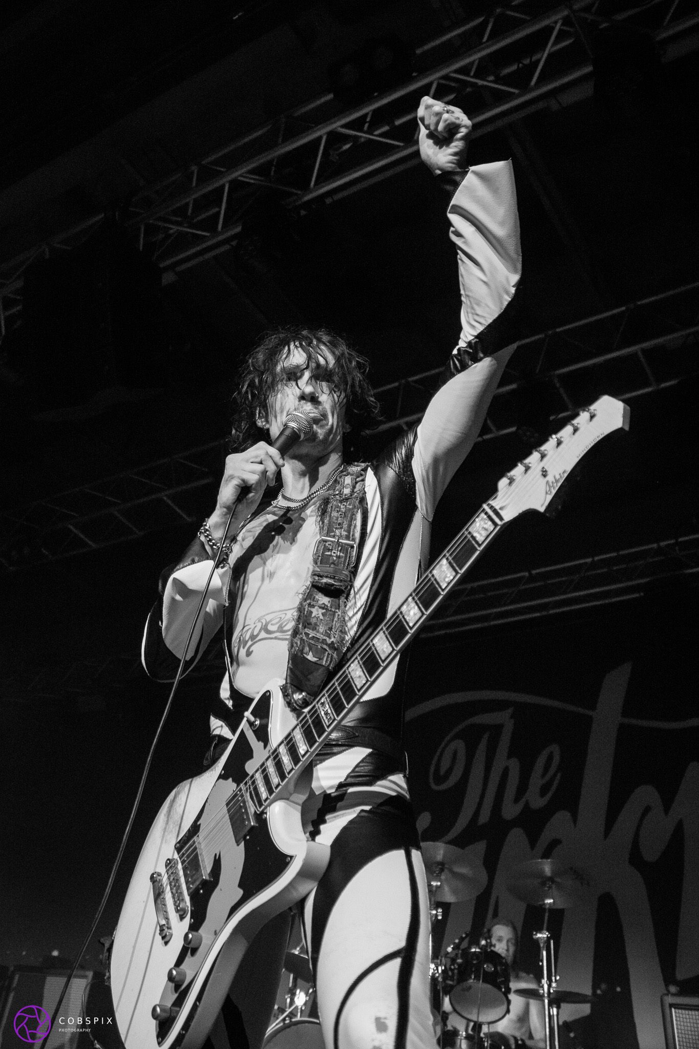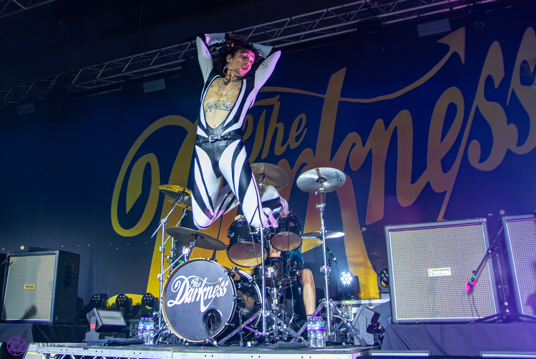 The set carried on with ‘Happy Birthday’ for birthday boy Dan and the crowd all joined in. Banger after banger followed including ‘The Best Of Me’, ‘Love Is Only a Feeling’ & ‘Stuck In A Rut’. Manchester were in high spirits for the whole gig and sang every song back. Rufus was so focussed and smashed every beat out of them drums, bassist Frankie was on a pout mission in his fabulous suit, and guitarist Dan displaying his super talent, together with the fabulous front man, this band prove they are still as tight as ever! It’s not a Darkness gig without the well known cracker (see what I did there) ‘Christmas Time’ track, perfect for this time of year. The band left the stage to huge cheers after Hawkins high pitch tones rang around the venue from ‘I Believe In a Thing Called Love’.